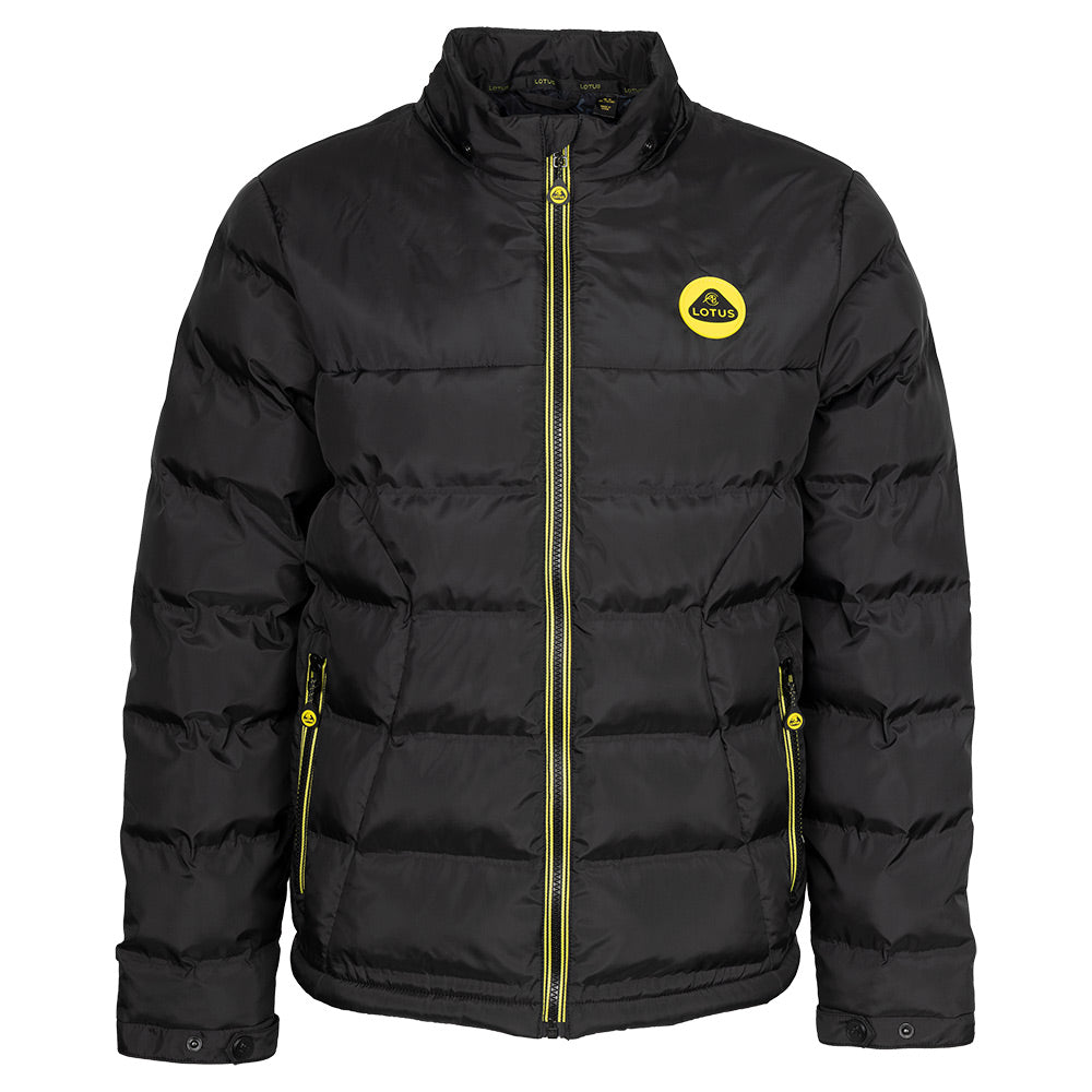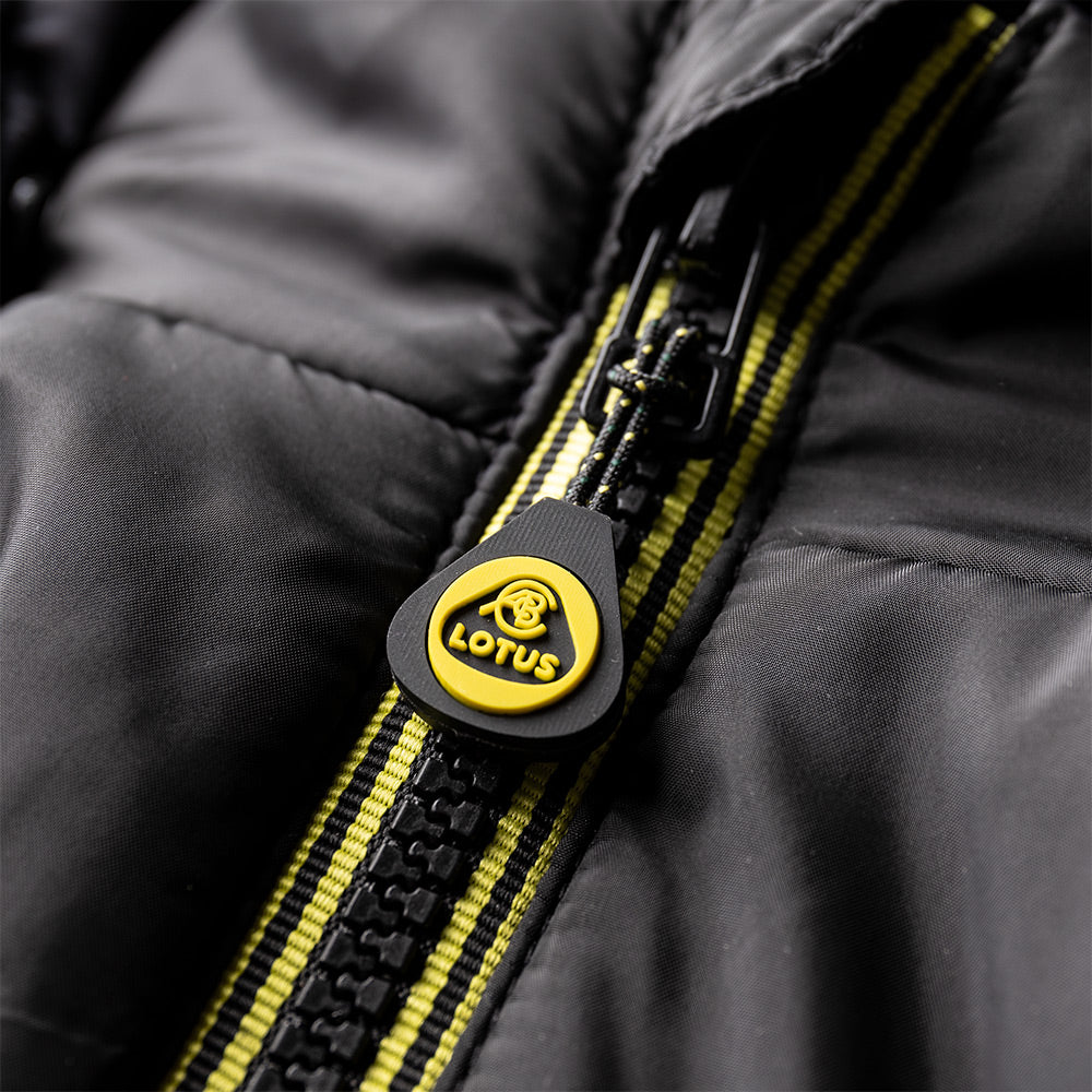 Indulge in the luxury of a 100% polyester shell, made with environmentally-friendly wadding. Adorned with iconic Lotus yellow striped zip tape and a branded silicone zip puller, this jacket exudes sophistication. The Lotus Roundel silicone logo on the chest and Lotus print on the lining add a touch of artistry and exclusivity to this timeless piece.
