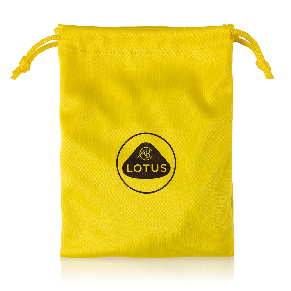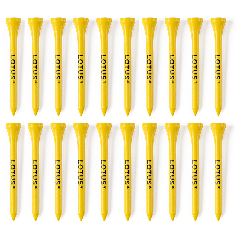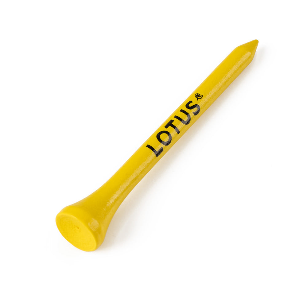 20x Lotus yellow wooden golf tees printed with the Lotus Wordmark, packed in a microfibre draw string bag.