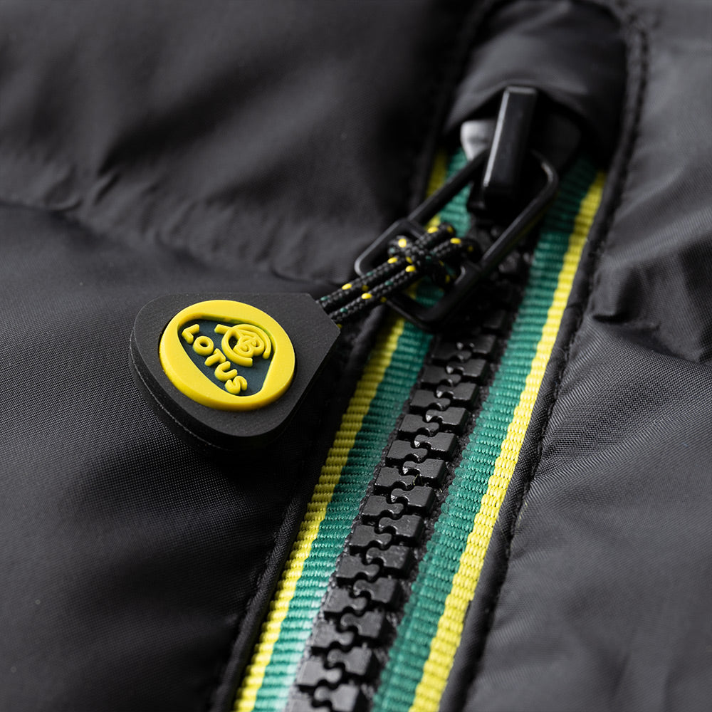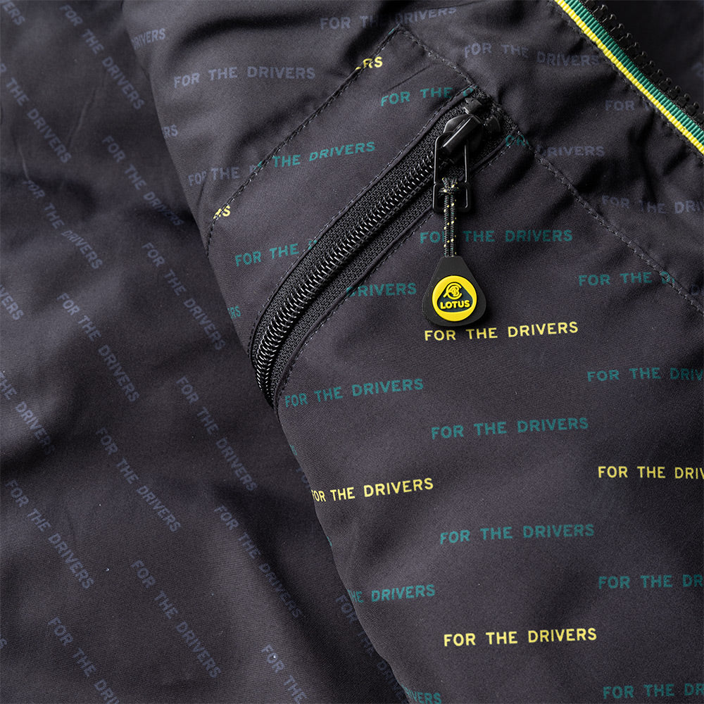 100% polyester shell with eco wadding, features Lotus yellow and green colour on the zip tape, branded silicone zip puller, Lotus Roundel silicone logo on the chest and ‘For The Drivers’ print on the lining.
