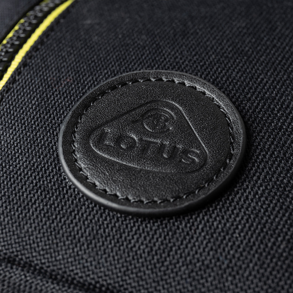 Cross body shoulder which features Lotus Roundel branding on the outer, logo silicone zip pullers, yellow striped zip tape and weave pattern lining. Bag features 2 main compartments and a detachable shoulder strap, made from 100% nylon.